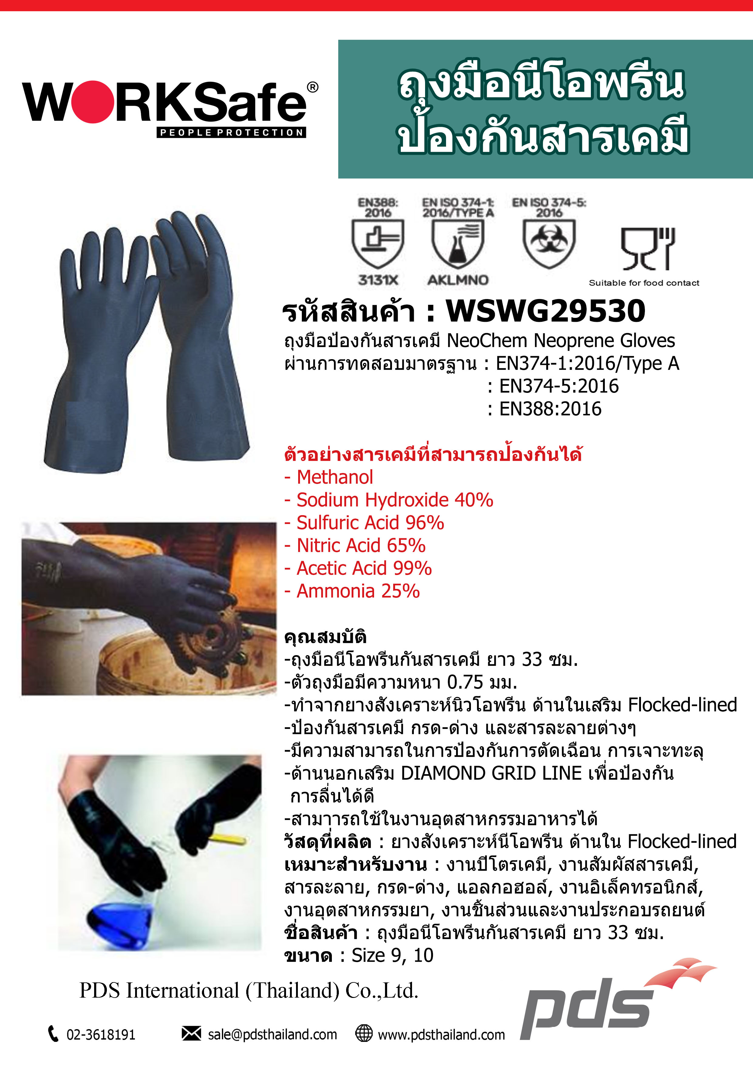ถุงมือนีโอพรีน ป้องกันสารเคมี ทำจากยางสังเคราะห์นิวโอพรีน ด้านในเสริม Flocked-lined ตัวถุงมือมีความยาว 33 ซ.ม. ความหนา 0.75 มม. ด้านนอกเสริม DIAMOND GRID LINE เพื่อป้องกันการลื่นได้ดี สามารถใช้งานอุตสาหกรรมอาหารได้
